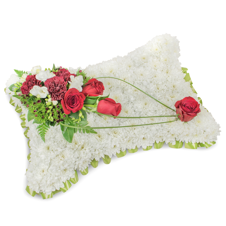 Express your deepest condolences with our charming sympathy bouquet, thoughtfully designed to offer solace and beauty. This lovely arrangement includes white chrysanthemums, passionate red roses, fragrant white freesias, dark red carnations, delicate dianthus, and lush bear grass.